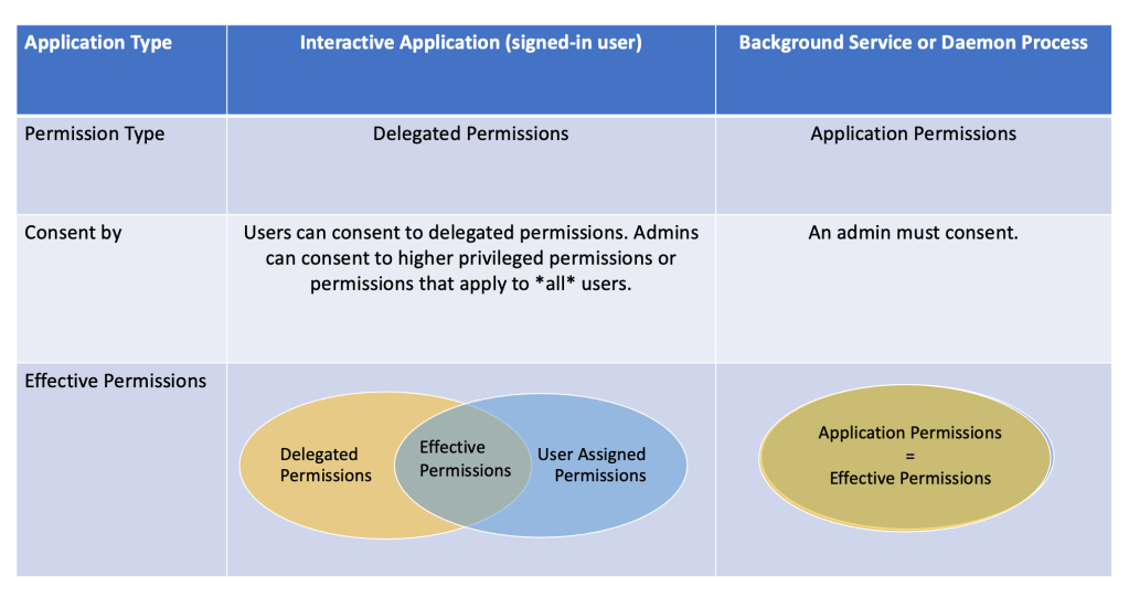 There are different types of permissions mostly because they are meant for different types of applications and processes. Here is a quick summary of the types of permissions, their intended use, the consent required, and the effective permissions.
