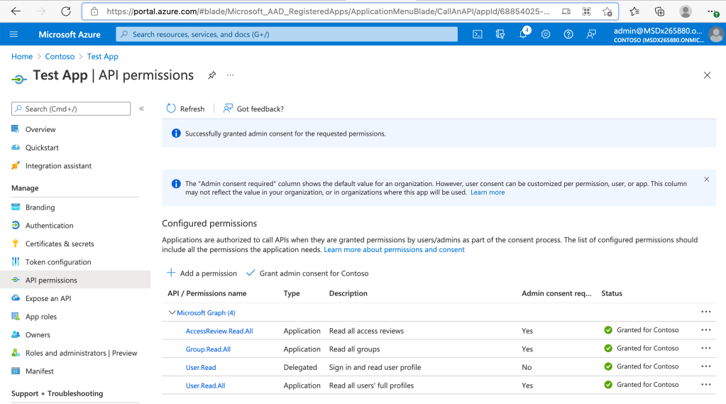 The permissions referenced above are assigned via the Application Registration menu, within the API permissions blade: