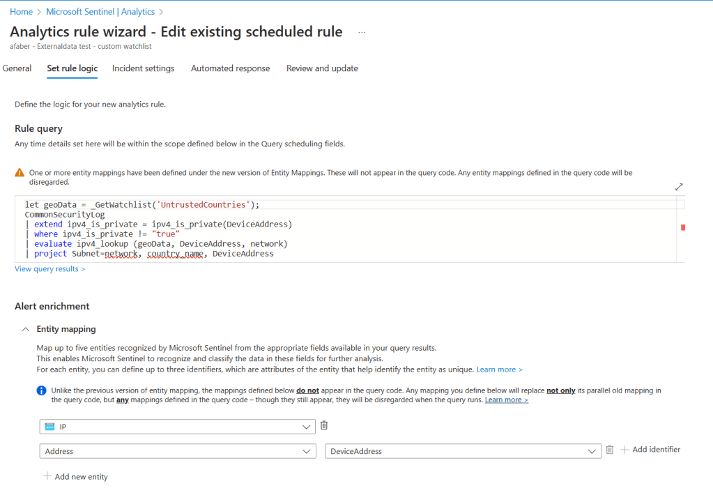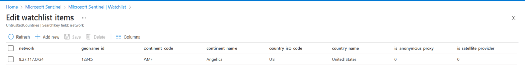 This is where I would use a real Sentinel watchlist, which exists within each of the customers’ workspaces. This is not meant to be updated by the MSSP, so you just need to create it initially and then the customers can update it directly as needed. When the MSSP creates this watchlist it should be created with a specific name, in my example I used UntrustedCountries. Although looking at the contents now, I probably should have named it UntrustedIPRanges.