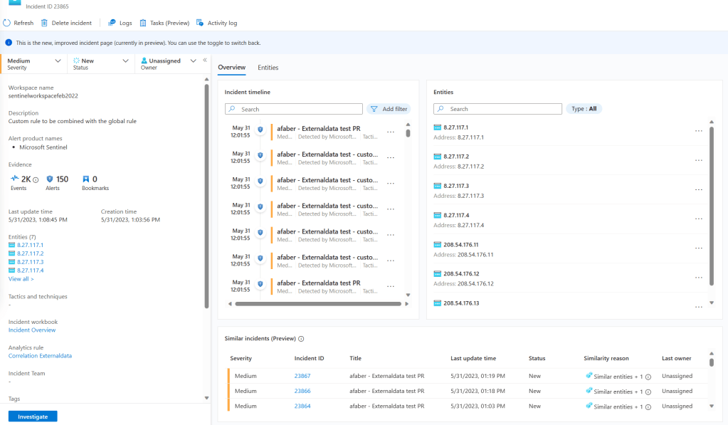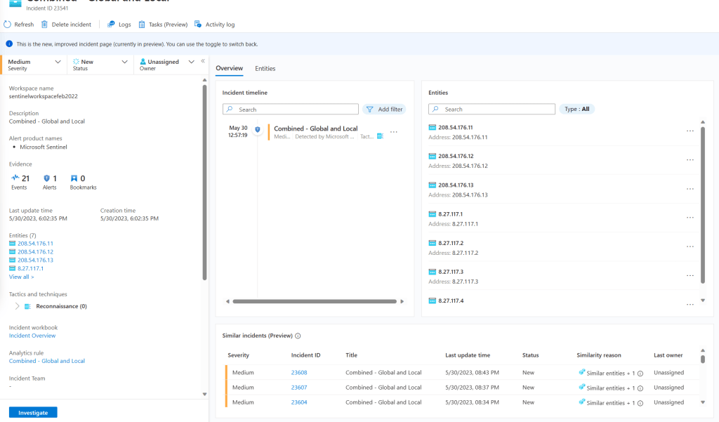In the correlation example above, I configured Entity mapping to allow me to preserve the entities from the original alert. At the end the result is very similar with the incident created, specifically when it comes to the incidents showing the original entities. In this case the entities are the IPs that are associated with those alerts.