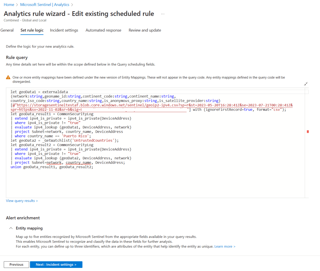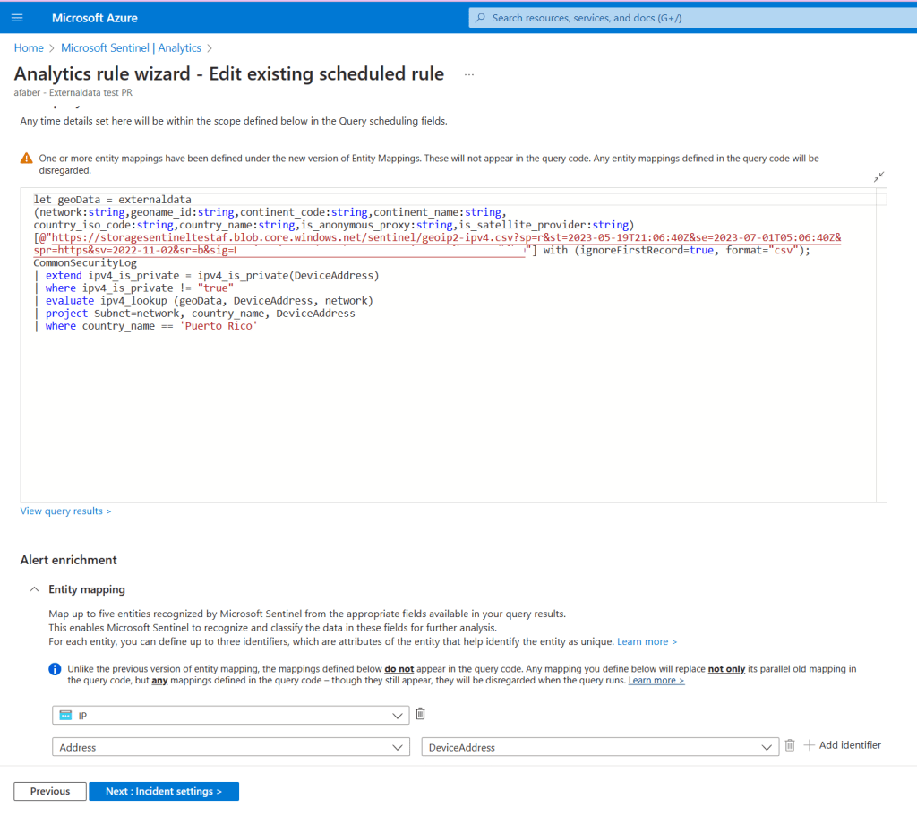 In the rule above, I am using the externaldata operator pointing to an Azure Blob Storage file, which is one of the options supported. Specifically, I am using a SAS token and URL with a predetermined expiration date. Also, in the example above, I am generating alerts for a specific country, Puerto Rico, aka Isla del Encanto😊, because in my test scenario I don’t expect any connections from that location. This is obviously just an example.