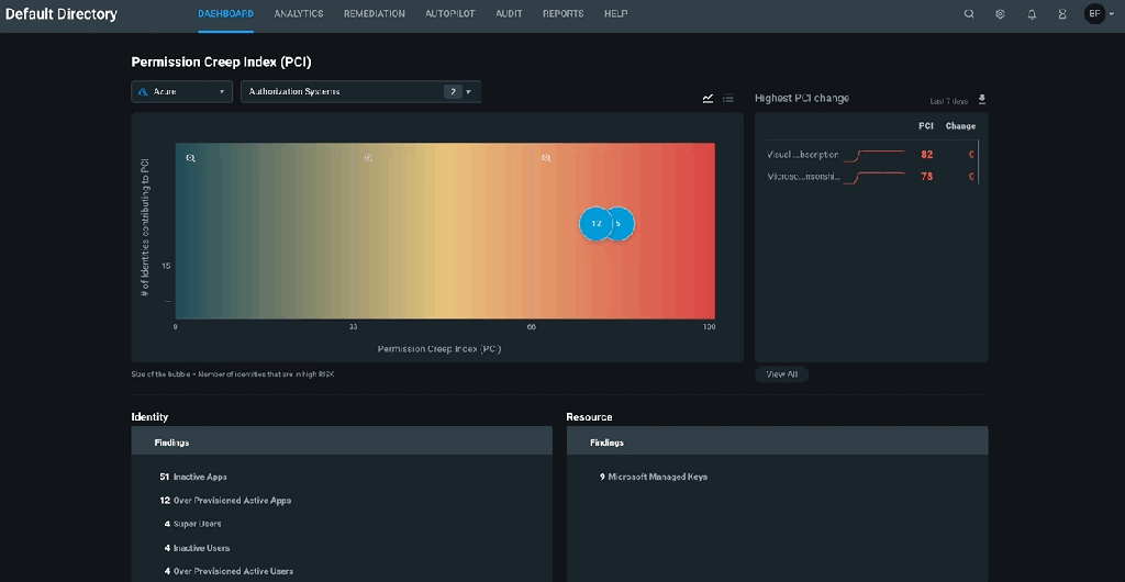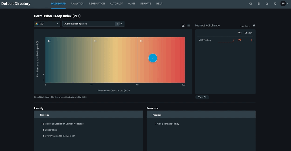 After you onboard your various Azure subscriptions, AWS accounts, and GCP projects, the first thing you will get is access to the PCI or Permission Creep Index. PCI is basically your risk level based on how overpermissioned your identities and resources are. Below you can see the PCI for my various subscriptions, accounts, and projects.