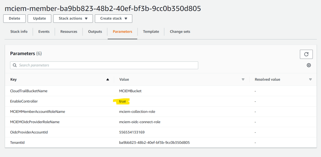 I was able to update it by creating a change set for my stack in AWS, specifically the one for the Member Account Role, for which I just used the default name of mciem-collection-role, as you can see below. I want the EnableController to be set to true because I want to be able to trigger remediations from CloudKnox into my AWS account, but this is up to the organization.