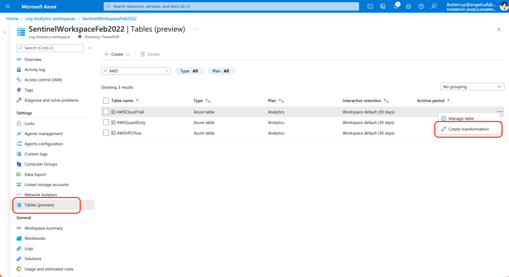 In my case I am testing with the AWSCloudTrail table, so I chose to “Create transformation” within the menu of the table, and then I gave my new rule a very creative name “TransformationDCR“.