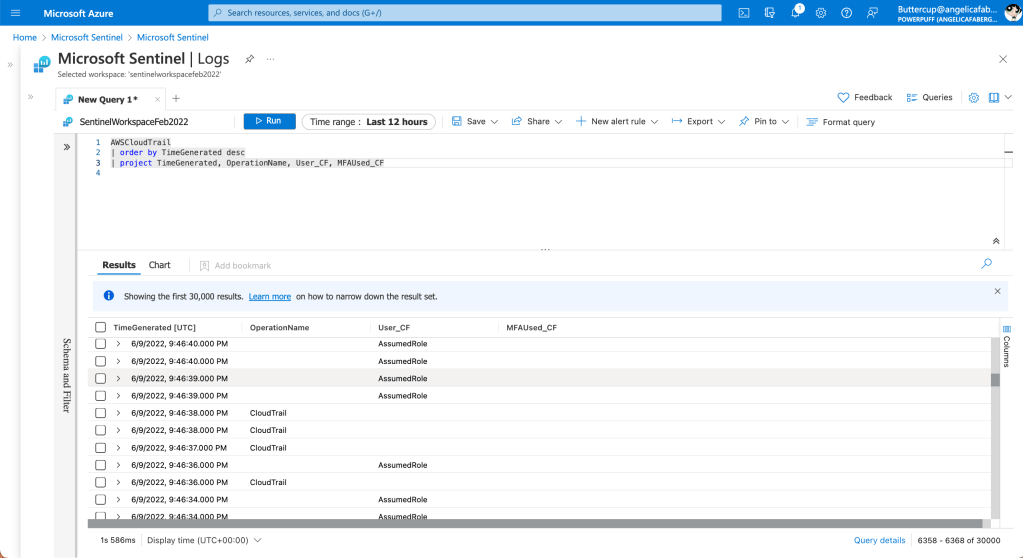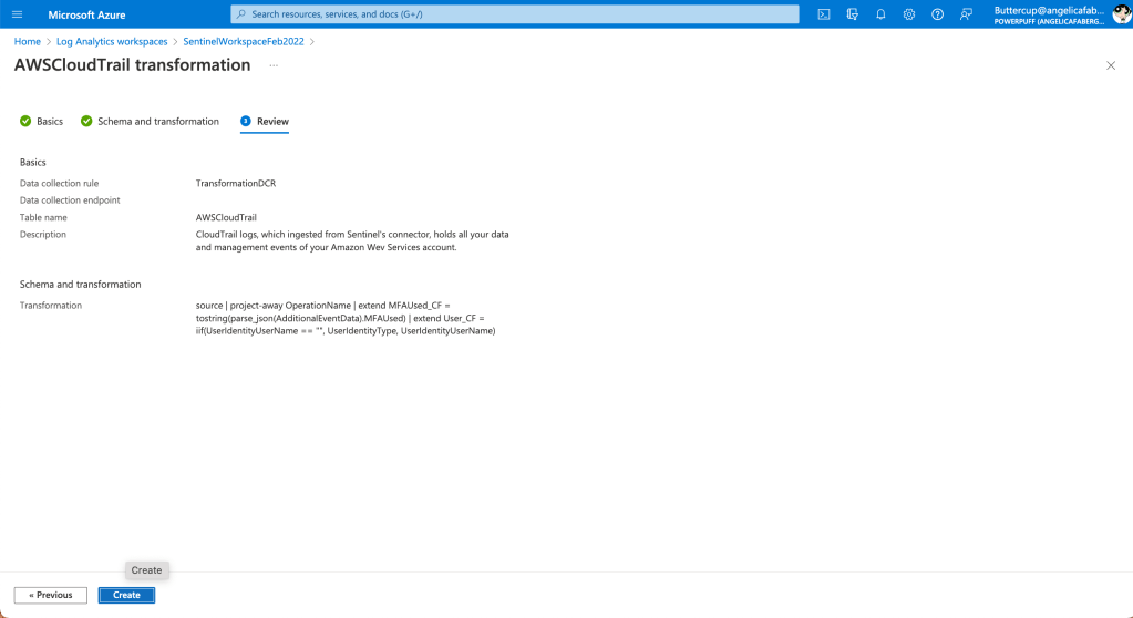 I then specified the columns I don’t want to ingest and the ones I want to add within the “Transformation editor“. In my case, I don’t want to see “OperationName” because all the rows have the same value, “CloudTrail“, so I use project-away to filter that out. But just for testing purposes, I am adding two new columns, “MFAUsed_CF” and “User_CF“. The ‘_CF‘, which I *think* stands for custom field, is only needed for non-custom tables.