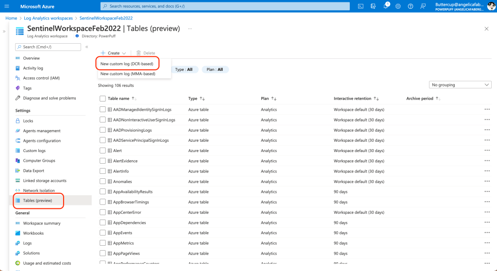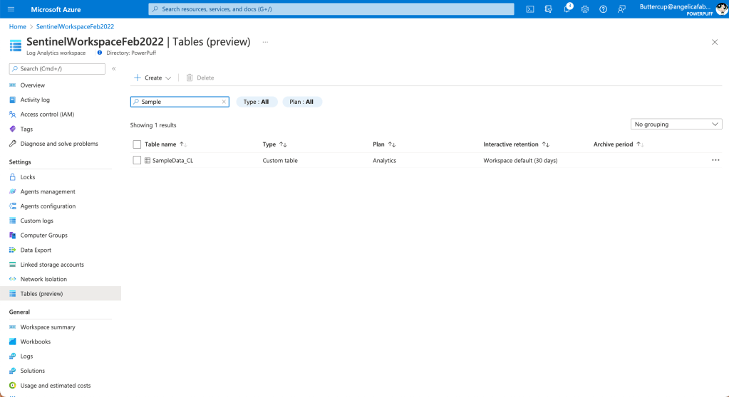 You can find this new features by navigating to the shiny new “Tables” blade within the Log Analytics Workspaces menu, as shown below: