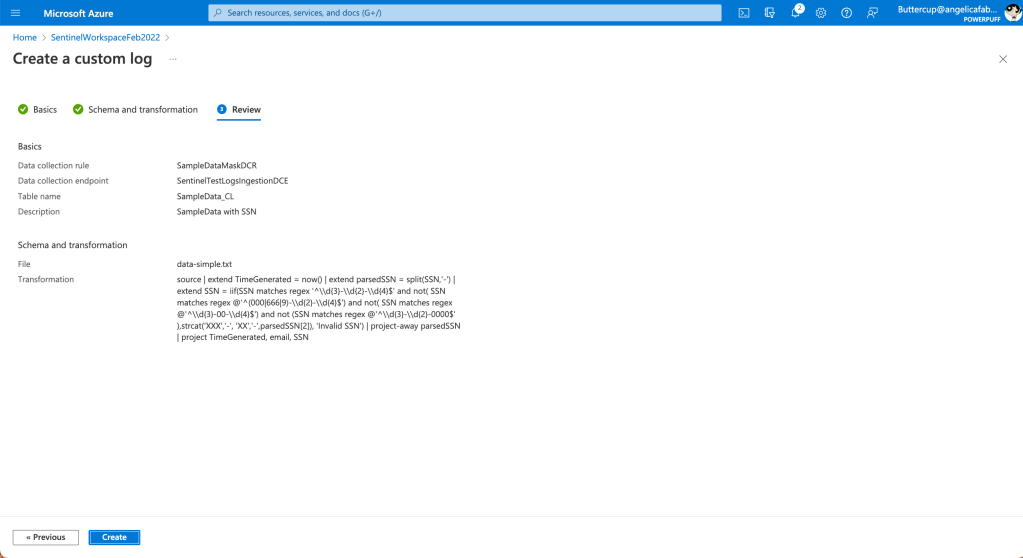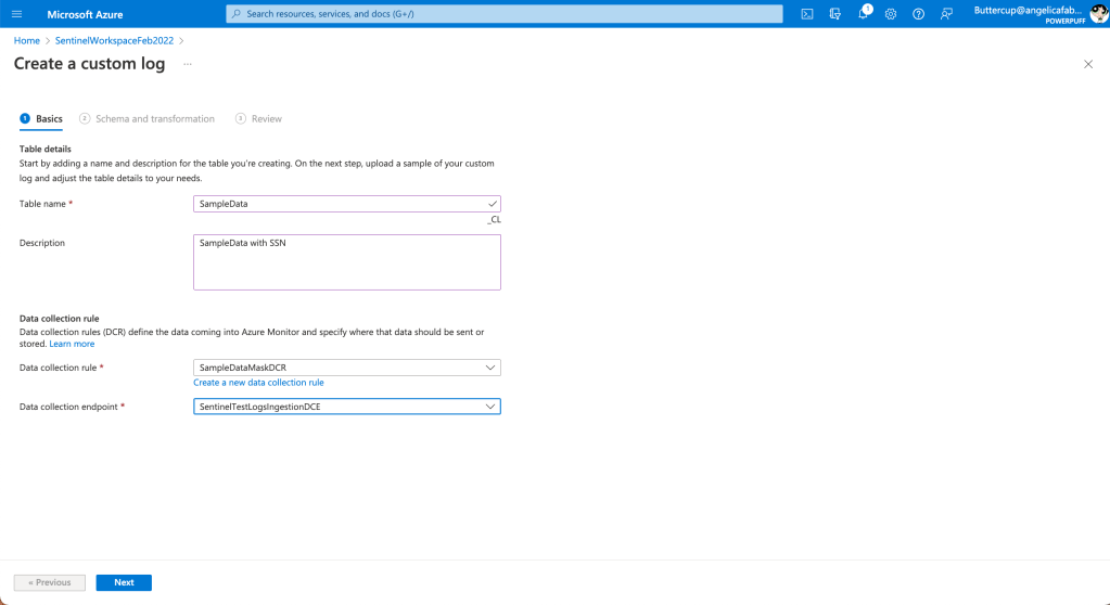 I am choosing the ingenious name of “SampleData” for my custom table and the DCR will be have the innovative name of “SampleDataMaskDCR“, as shown below:
