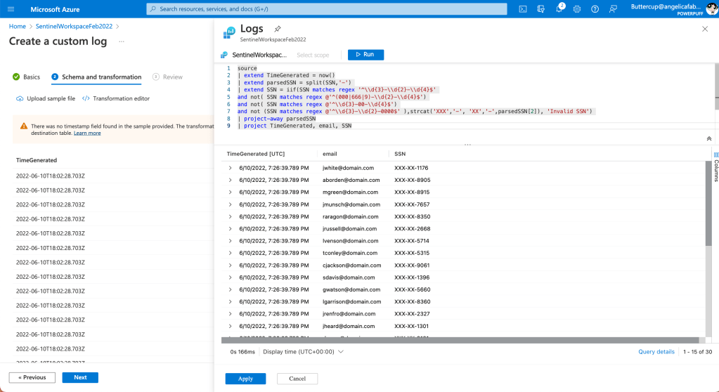 It then automatically adds that first line (TimeGenerated), which I will leave as is, since I just need it for testing purposes. Then I added one of the masking samples found in the library of transformations to mask the SSN values, as shown below: