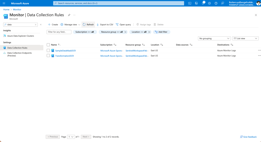 Also, if I want to check the DCRs created, I can see that information from the Monitor portal, as shown below: