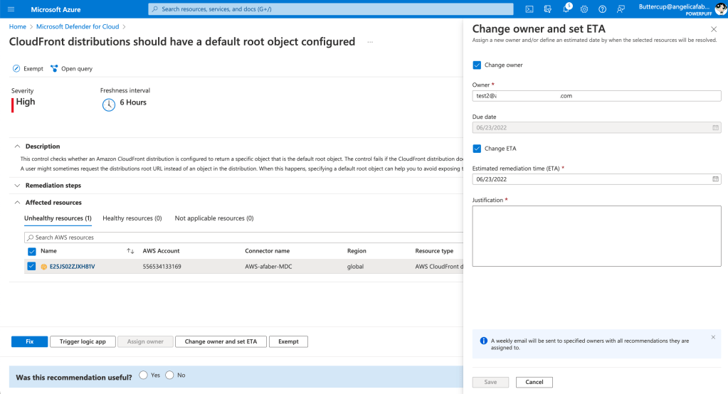 It’s not just for Azure subscriptions, you can do the same for AWS accounts and GCP projects that are connected to MDC. In the example below I have chosen to assign all ‘CloudFront’ recommendations to a specific user, as shown below: