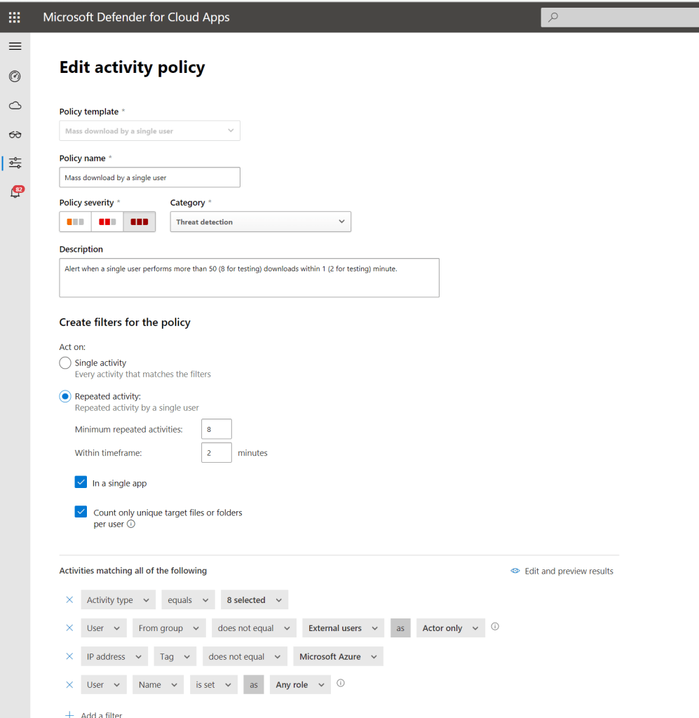 But I have chosen to show you how this “Mass download by a single user” policy works. Note that I have adjusted some of the values, so I can generate an alert for my test.