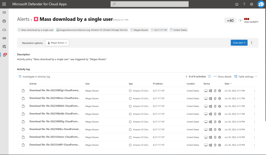 Because I know you may be thinking ‘but this is all within Microsoft services‘. So, check this out! This alert was generated by a user that downloaded files from an AWS S3 bucket, as shown below: