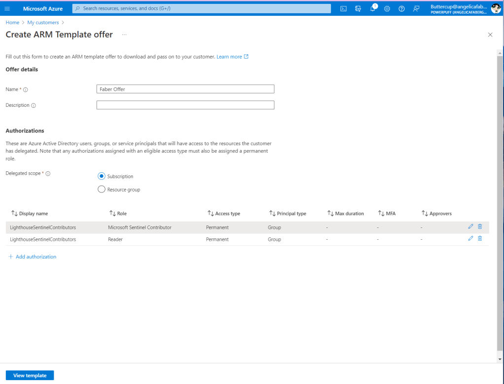 When you configure the initial Azure Lighthouse template to delegate access from the customer workspace to the MSSP, there are some modifications required in order to allow the MSSP users and groups to be able to assign the access. You have to modify the template manually, and you have to specifically add the “User Access Administrator” role (18d7d88d-d35e-4fb5-a5c3-7773c20a72d9) and the “delegatedRoleDefinitionIds” parameter, which is required to specify the roles that the MSSP user or group will be able to assign to the managed identities within the customer workspace.