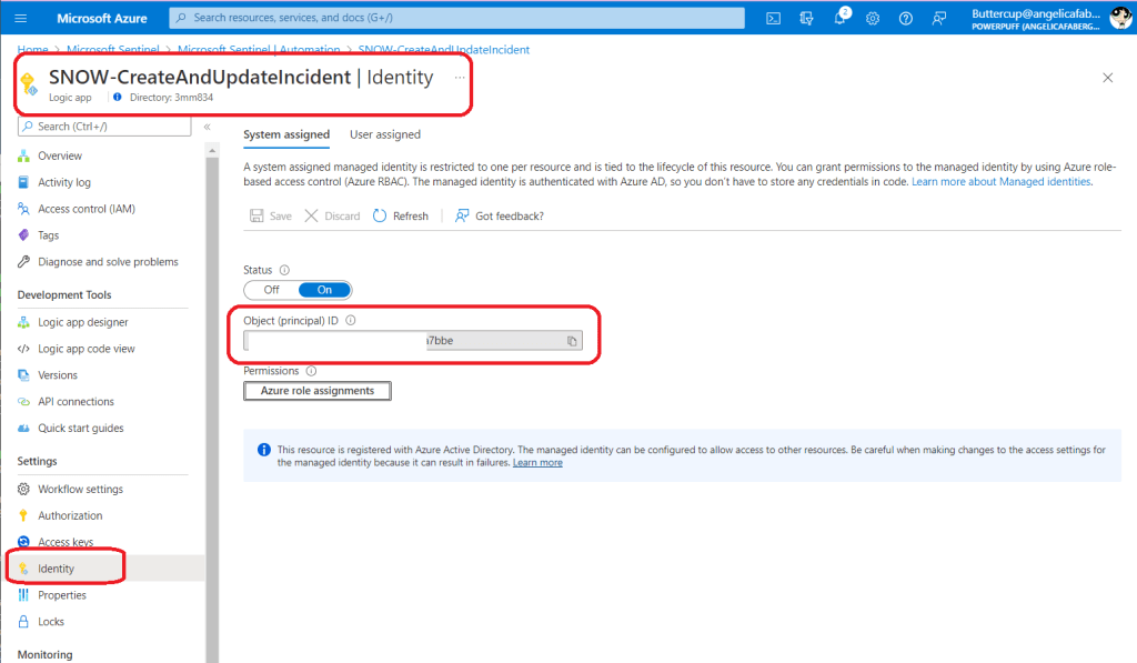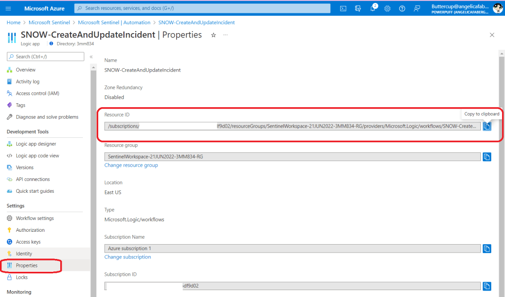 “delegatedManagedIdentityResourceId” – This is the Resource Id of the delegated managed identity resource in the customer’s tenant. This is also the reason we need to use API version 2019-04-01-preview or later. You can just copy and paste from the playbook “Properties” tab, as shown above.