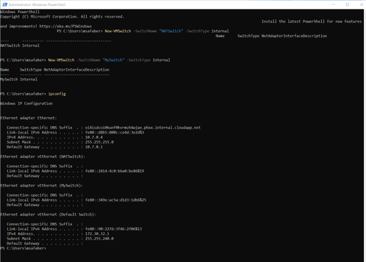In my case, my Windows 11 host Ethernet adapter is assigned an IP of 10.7.0.4, therefore I used 192.168.0.0/24 as the network scope of the “NATSwitch”. And I created the two switches as shown below: