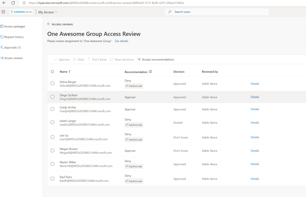 During the first stage, the reviewer gets to review all the members of the group, as shown below. And as you can see, the reviewer, Adele, has approved 5 of them, denied 1, and selected “Don’t know” for 2 of them.