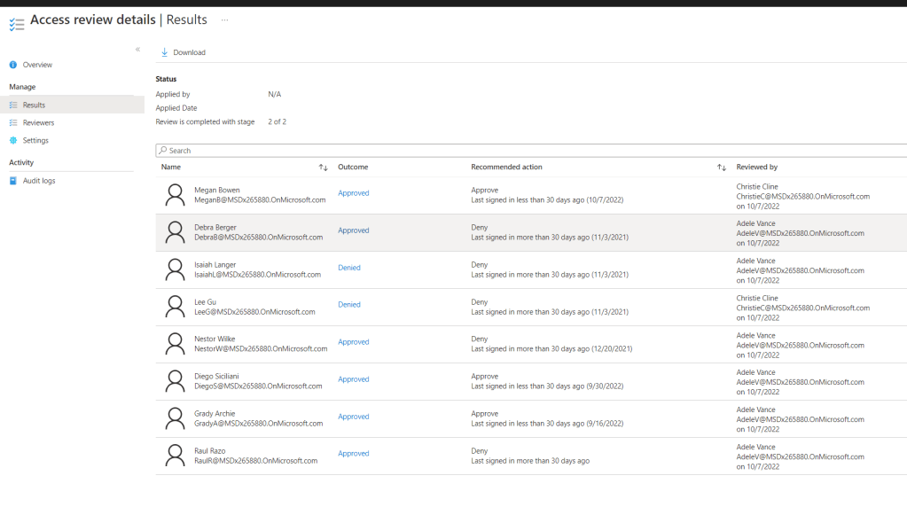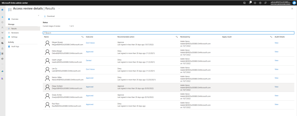 They can see that in the previous stage Adele selected “Don’t know” for 2 of them, which are the ones this approver gets to review. So, this is where the auditor would step in to make that final decision and therefore prevent any reviewees that were neither approved, nor denied.