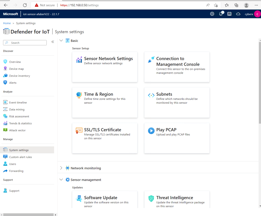 Back in the Azure VM, I can now open a new browser session and connect to https://192.168.0.50 (my sensor IP). Please note the first time you connect you can configure a certificate to be used for this connection, or you can just use the default one, which is what I am using and why it shows as Not secure in the browser. Also, the first time you connect you will be required to upload that file you downloaded during the registration process (step 3).