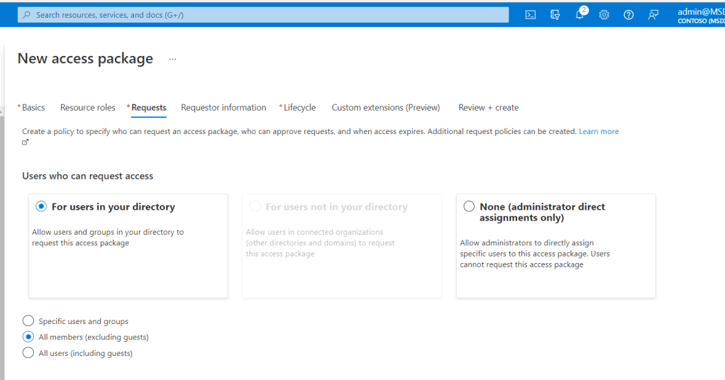 In the example below, I am making the access package available to be requested by “all members (excluding guests)”, that way I can isolate specific set of permissions from my guests and maybe I can create a separate access package that is just for guests, with those permissions that the enterprise has deemed appropriate for guests.
