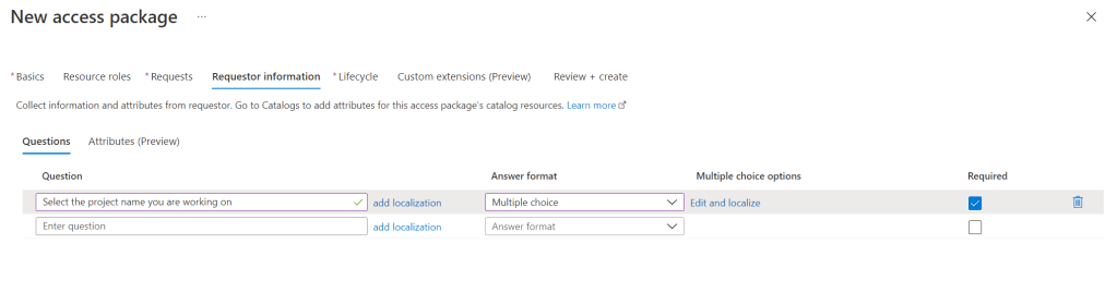 Notice above the “For users not in your directory” is greyed out, this is because this access package is created within a catalog that is not enabled for external users, as you can see below. This is a flag that can be controlled and can be very useful to isolate permissions.