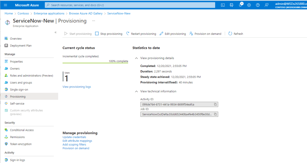 For example, on my demo tenant I configured a few solutions to provision users and their roles to target applications. This example is for ServiceNow, where I configured provisioning and the job runs every 40 minutes.