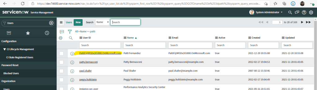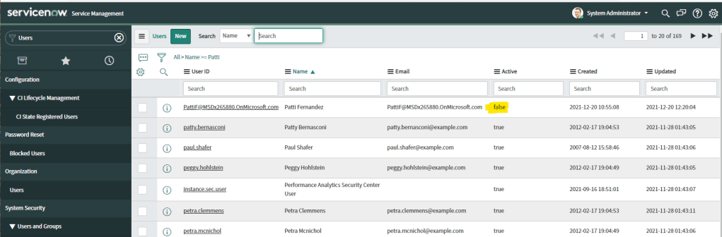 And when I remove Patti from the assigned users/groups, she is also disabled in ServiceNow: