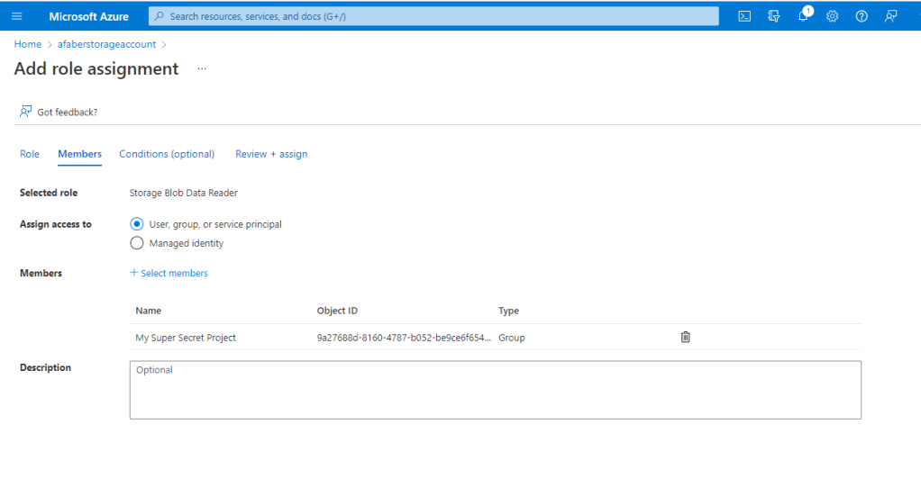 So, when I go to assign the Storage Blob Data Reader role, I can assign it to a group that includes all three users, as members of the ‘My Super Secret Project’ group: