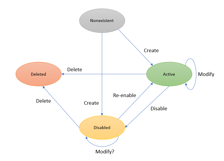 User identities go through various main stages in the lifecycle. The typical stages are non-existent, active, disabled, and finally deleted. There are also possible transitions between those stages, as depicted below:
