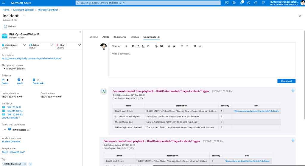 After the playbook runs, the severity is now raised to ‘High’, there is a new tag added ‘RiskIQ Malicious’, and the status changes to ‘Active’.
