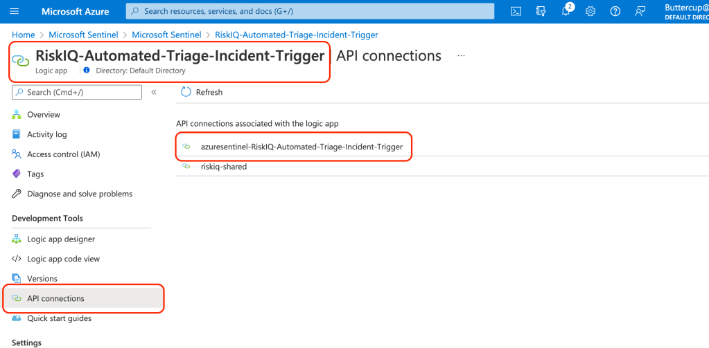 To ensure the playbooks have access to both RiskIQ and Sentinel you will have to ensure the associated API connections show as “connected”.