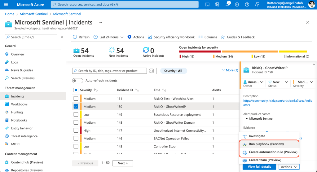 While I am here, notice that this incident (150) was automatically created with a ‘medium’ severity, since that’s what I configured in the analytic rule. Now I can run the playbooks from the incidents blade as shown below.
