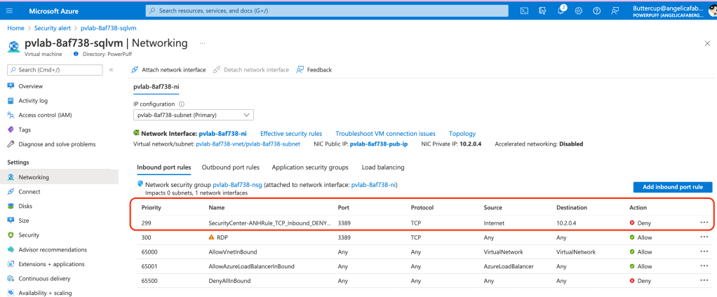When I clicked on “Enforce rule“, it gave me the option to immediately update the network configuration to block port 3389 for that server. This recommendation came from the adaptive network hardening recommendations, so it is based on a machine learning algorithm that “factors in actual traffic, known trusted configuration, threat intelligence, and other indicators of compromise, and then provides recommendations to allow traffic only from specific IP/port tuples“. That means the recommended rule will take into account any legitimate sources.